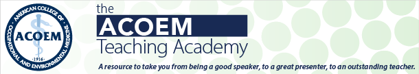 ACOEM’s five-part video series on Presentation Excellence will benefit anyone presenting to any audience for any period of time — from two minutes to two days. Our goal is to help presenters advance from being “Good” speakers, to “Great” presenters, to “Outstanding” teachers. Read more, including an interview with the hosts, here.